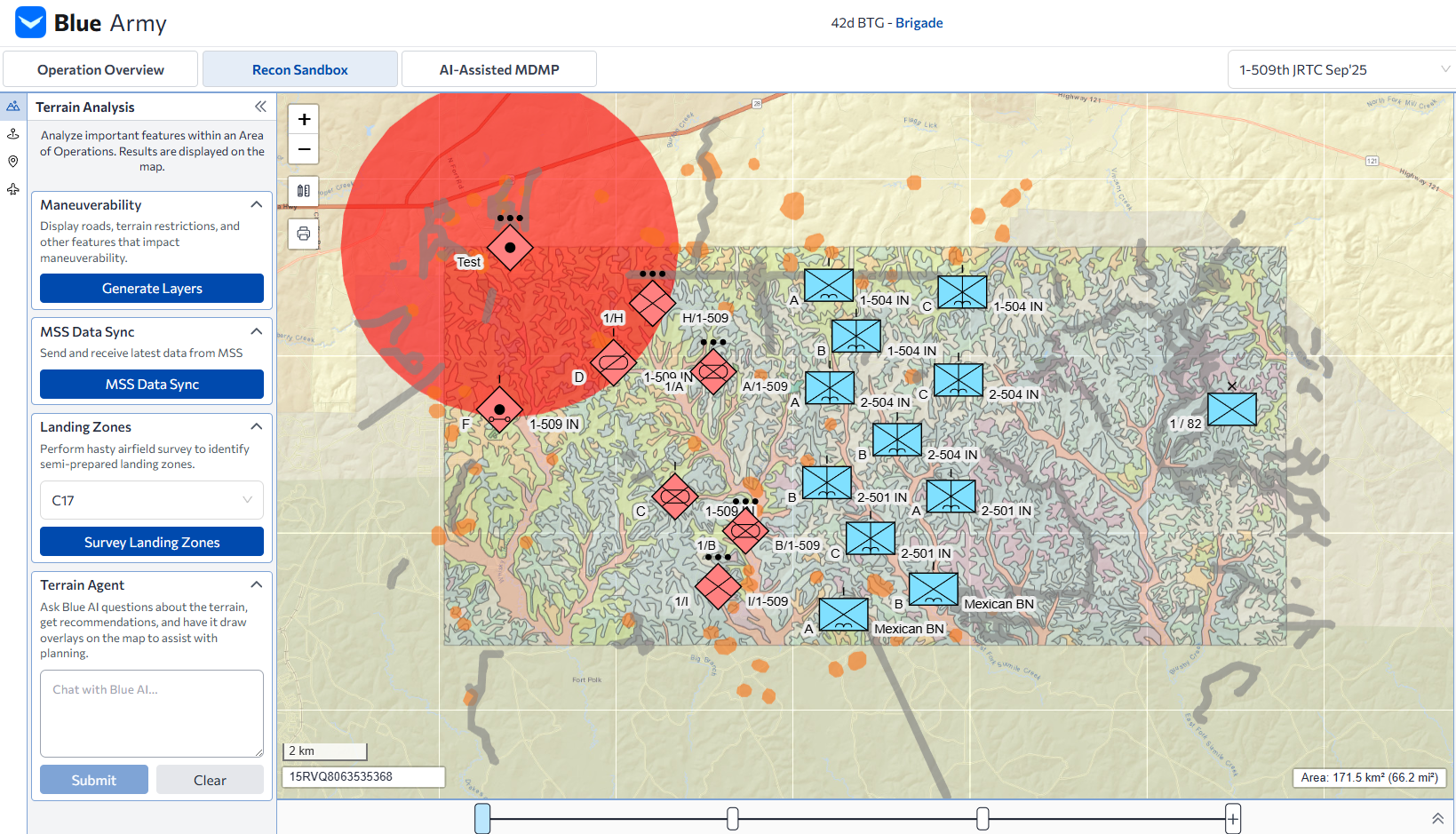 Blue is a suite of decision-support products that generates and wargames tactical echelon courses of action. Blue enables planning workflows tied to operations orders or sandbox placement of units in time and space, leveraging multiple world models to produce feasible, acceptable, and suitable COAs. Optimized for Army brigades and battalions, Blue is focused on delivering the decision advantage to the tactical edge.